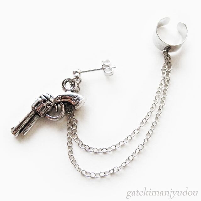 ピストルモチーフの揺れるピアスとイヤーカフスを2連のチェーンで繋げました。