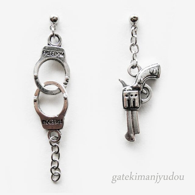 手錠と銃、左右それぞれ違うモチーフのスタッドピアスです。