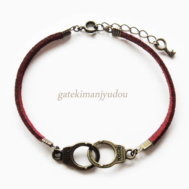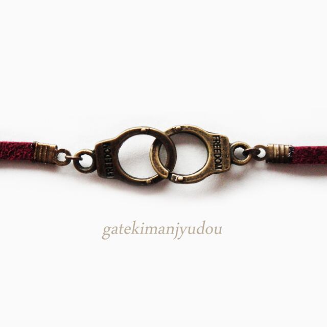 手錠モチーフがメインのバーガンディー色のレザーコード(合皮)ブレスレットです。