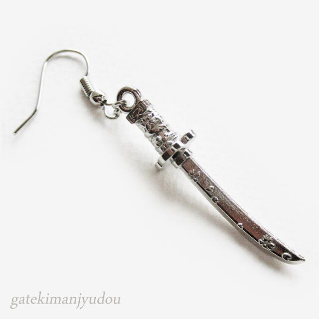 刀身に桜の柄が入った日本刀と狐面の左右異なるモチーフを使ったフックピアスです。
