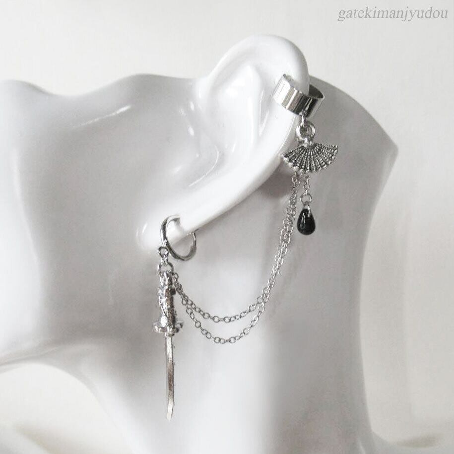 日本刀のフープイヤリングと小さな扇と黒色のチェコビーズが揺れるイヤーカフスを2連のチェーンで繋ぎました。