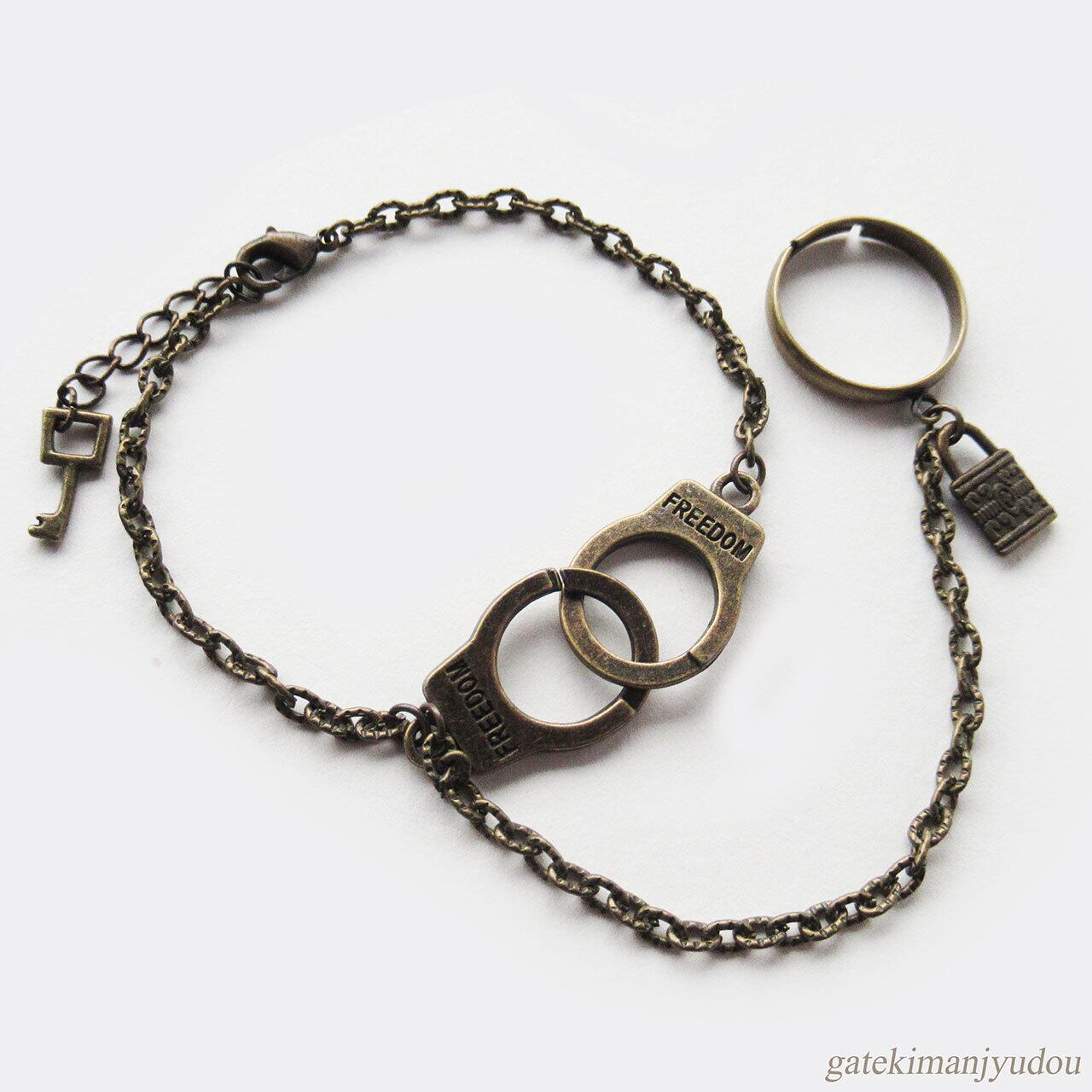 手錠モチーフのブレスレットと南京錠のリング(指輪)をチェーンで繋いだ一品です。